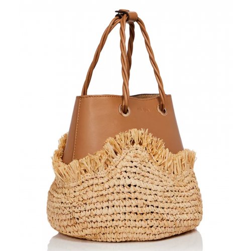Main: leather; trim: 100% raffia; lining: 50% nylon/50% polyester